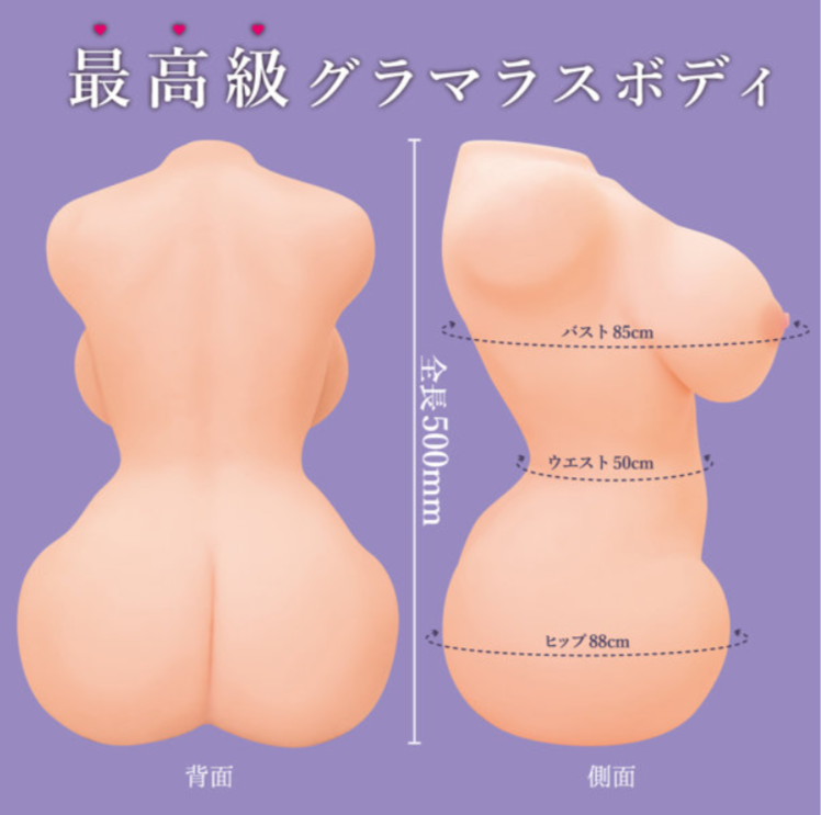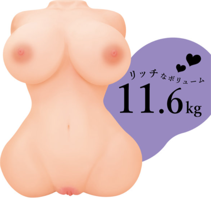 両腕で抱えた瞬間の11.6kgが「人の重み」を再現。全長約50cm、胸は手のひらがじわっと沈む柔らかさ、胴は押し返すコシで体勢が安定。内部は二穴仕様で、入口はやさしく奥で締まりが強まる“メリハリ系”。体に当たる面積が広く、抱き枕みたいに密着できるのが最大の魅力。見た目の迫力よりも、触れた瞬間のリアルで評価が跳ね上がるタイプ。価格も(セール時)3万円以下を狙えるレンジで、ドール未満の入口として現実的や。